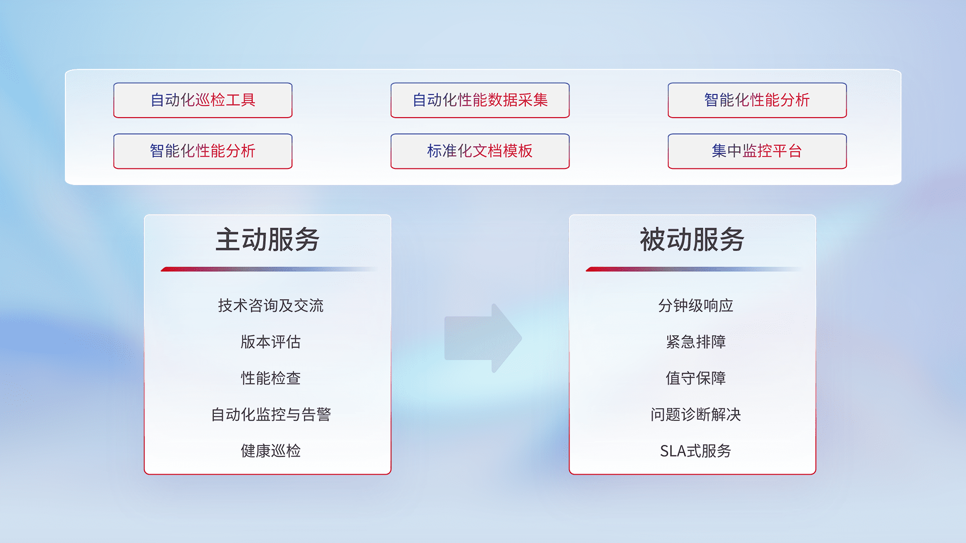 智能化工具和标准化文档,,,保障服务质量,,,,提供主动服务(包含技术咨询、、、、版本评估、、、、性能检查、、、、自动化监控与告警、、、健康巡检)和被动服务包含(分钟级响应、、紧急排障、、、、值守保障、、问题诊断解决、、、SLA服务)。。。
